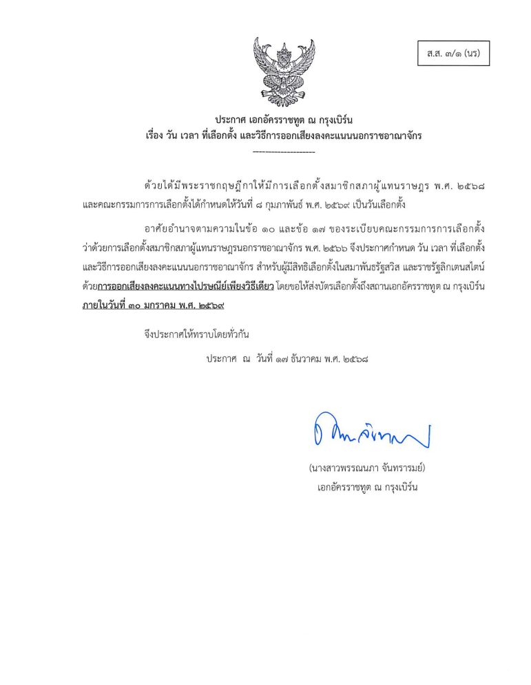 2. สถานเอกอัครราชทูตฯ อยู่ระหว่างรอรับบัตรเลือกตั้งและเอกสารที่เกี่ยวข้องจากประเทศไทย และคาดว่าจะจัดส่งเอกสารดังกล่าวให้ผู้ที่ลงทะเบียนสำเร็จตามข้อ 1 ได้ในช่วงกลางเดือน ม.ค. 2569