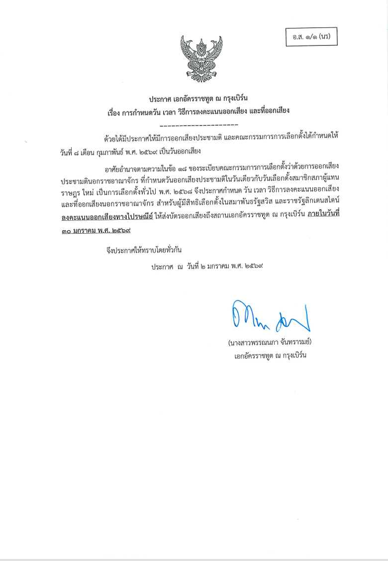 ประกาศ วัน เวลา ที่เลือกตั้ง และวิธีการออกเสียงลงคะแนนนอกราชอาณาจักร